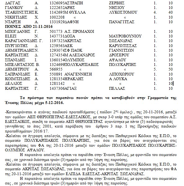 Η Πειθαρχική Επιτροπή της ΕΠΣ Πέλλας επέβαλε τις παρακάτω ποινές