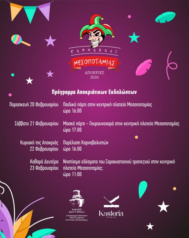 Ο Δήμος Καστοριάς και το Τοπικό Συμβούλιο Κοινότητας Μεσοποταμίας σας προσκαλούν στις Αποκριάτικες εκδηλώσεις της Δημοτικής Κοινότητας Μεσοποταμίας.