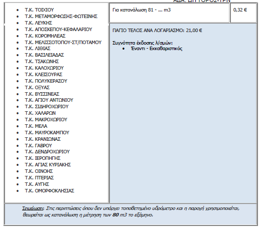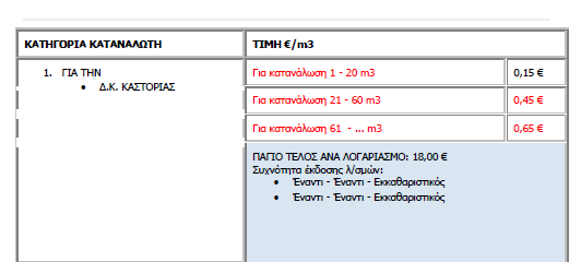 Η ΔΕΥΑΦλώρινας έχει πάγιο 14,22€/3μηνο και χρεώνει μέχρι τα 45 m3 με 0,29€/ m3