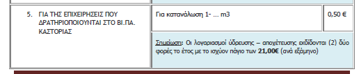 Το πάγιο αυτό συνολικά επιβαρύνει τους πολίτες της πόλης με 108€/έτος, των χωριών της πρώτης κατηγορίας με 63€/έτος, και της 2ης κατηγορίας με 42€/έτος.