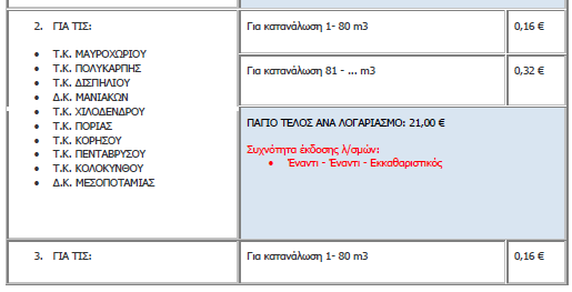 Η κατηγορία Νο2 παίρνει ραβασάκι με το μοτίβο Έναντι-Έναντι- Εκκαθαριστικός (όπως της πόλης) με 21€ πάγιο ΑΝΑ ΛΟΓΑΡΙΑΣΜΟ, κάθε τετράμηνο, ενώ, οι της κατηγορίας Νο3 παίρνουν ραβασάκι με το μοτίβο Έναντι-Εκκαθαριστικός ανά 6μηνο.